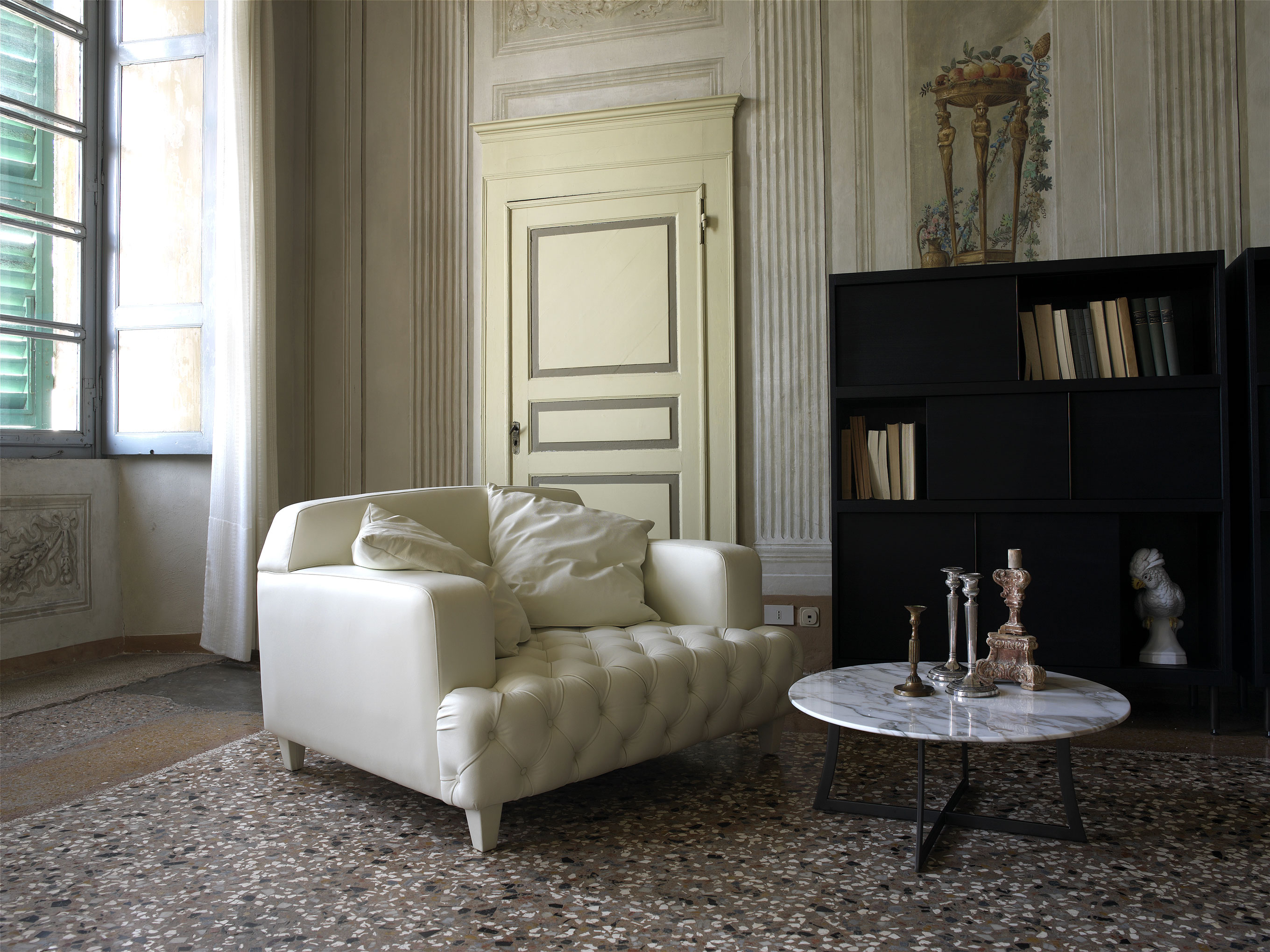 With Kreaty the well-established and increasingly articulated proposal of tables and chairs, armchairs of sofas, is enriched by some collections of design items such as bookcases, sideboards and accessories as well as an interesting range of original modern beds. Kreaty products are made of high quality materials: with metal, preferential material, there are also glass, leather, wood, cow-hide and plastics.